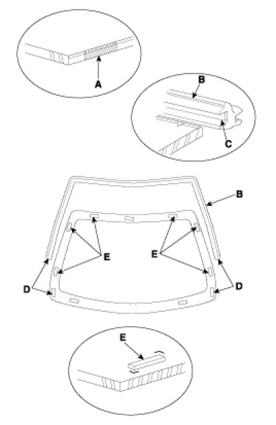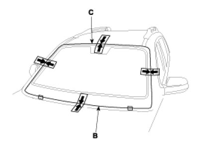 3. Install the windshield (A) upper molding (B) and fasteners (C). Do not allow any gaps.