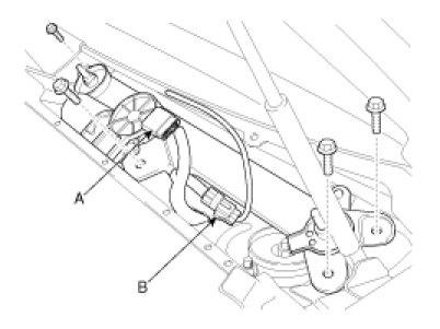 3. Remove the windshield wiper motor and linkage assembly after removing 4 bolts. Disconnect the wiper motor connector (A) and windshield deicer connector (B) from the wiper motor & linkage assembly.