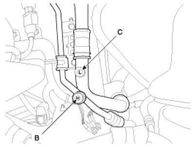 2. Connect an R-134a refrigerant Recovery/Recycling/Charging System (A) to the high-pressure service port (B) and the low-pressure service port (C) as shown, following the equipment manufacturer's instructions.